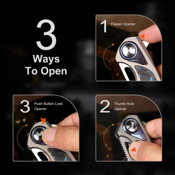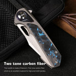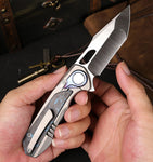 The Remette RT-Saker Falcon Folding Pocket Knife (ASTP-1) is a premium EDC tool that blends cutting-edge engineering with refined materials for serious performance and style. Its benefits include a S45VN blade with a satin finish and hollow grind for excellent edge retention and slicing capability, a titanium handle with carbon fiber inlays for lightweight strength and visual sophistication, and an innovative button lock structure with a safety lock for secure, ambidextrous operation. The caged ceramic ball bearing pivot ensures smooth, rapid deployment, while the titanium hardware and entropic anodized pivot collar add a custom touch. Built for enthusiasts who value precision and aesthetics, the Saker Falcon is a standout in any collection.